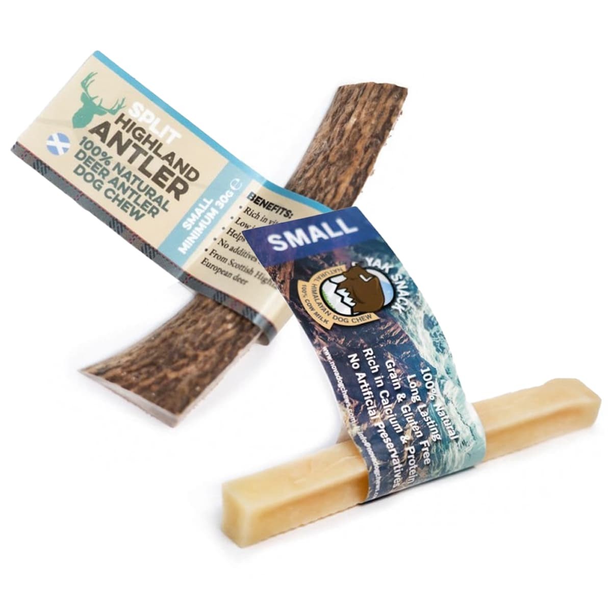 Komplektā ietilpst griezts briežu rags (S izmērs) un jaka siera kārums (S izmērs).