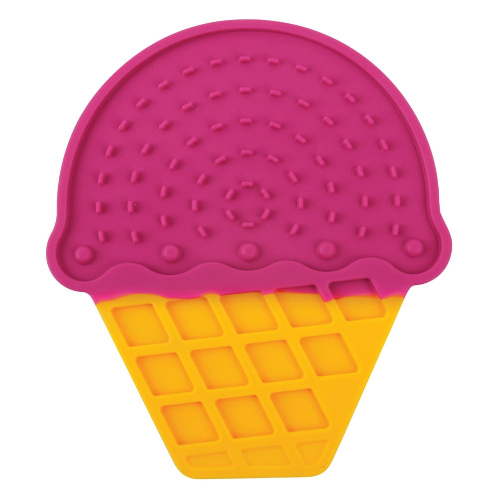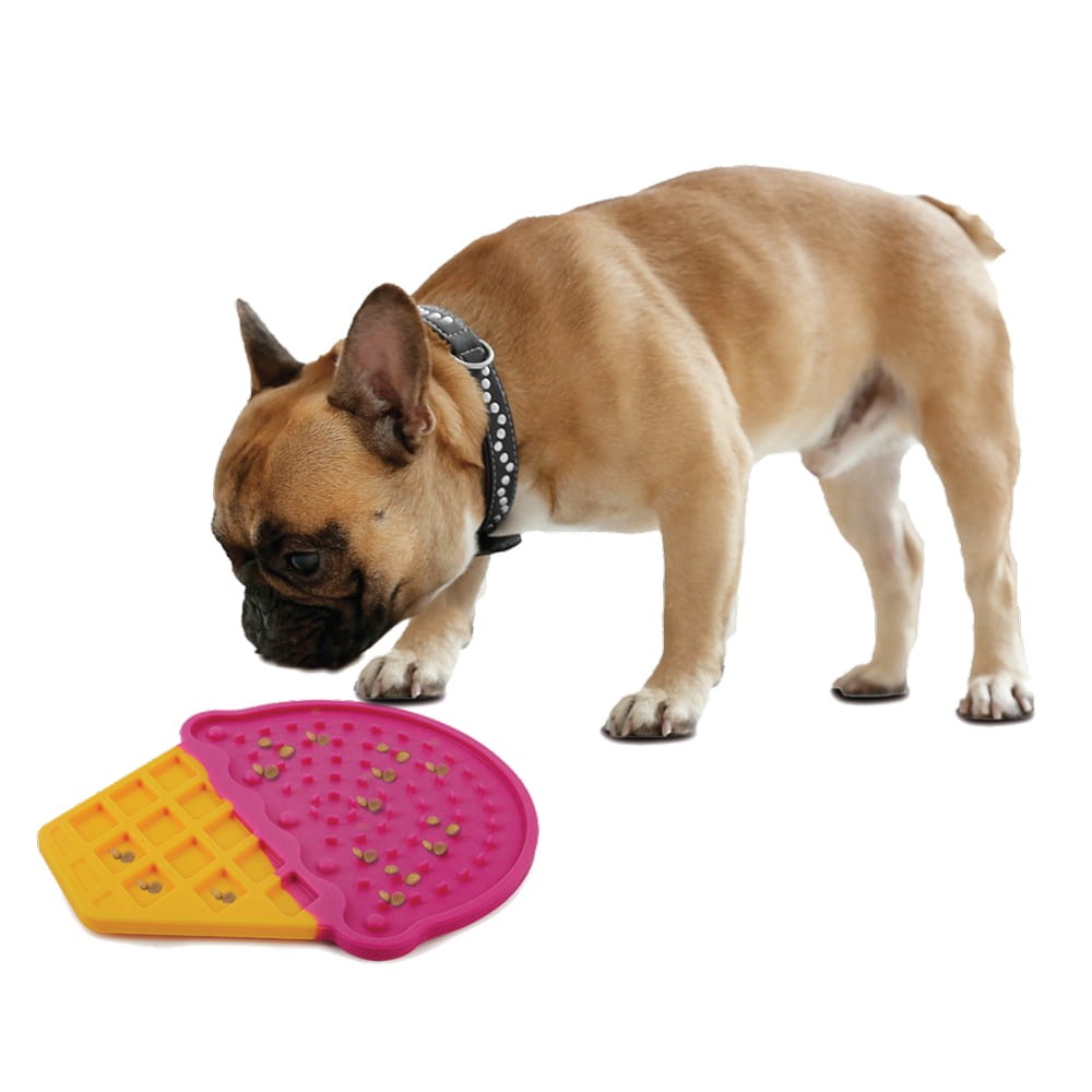 Saldējuma formas paklājiņu var piestiprināt pie jebkuras virsmas, pateicoties praktiskajiem piesūcekņiem otrā pusē. Pateicoties dažādajām tekstūrām, var izmantot gan sausus, gan svaigus pārtikas produktus. Piemēram, uzklājiet jogurtu vai zemesriekstu sviestu, lai novērstu suņa uzmanību peldes vai mazgāšanas laikā, vai uzklājiet parastu barību, lai novērstu suņa uzmanību un liktu ēst lēni. Šo pārtikas paklājiņu var izmantot daudzos veidos!