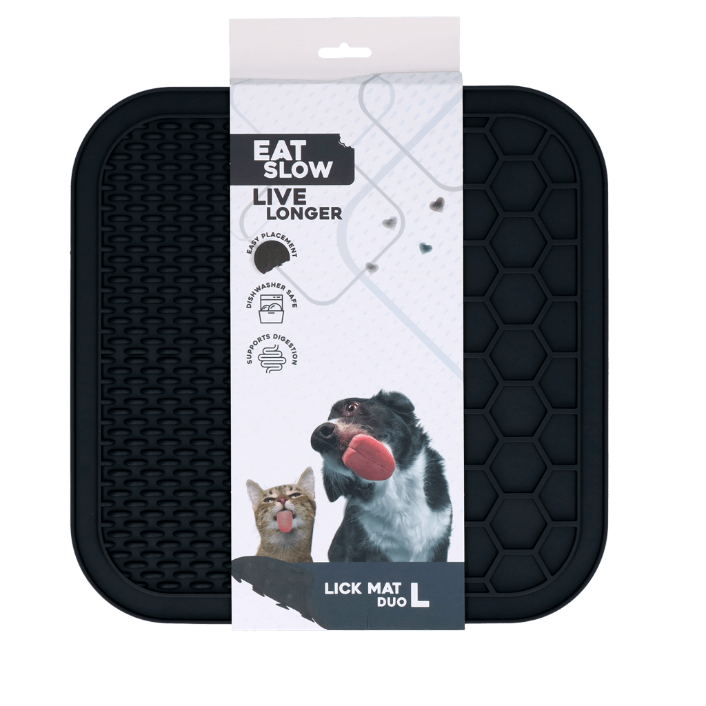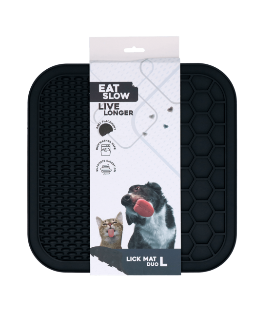 Eat Slow Live Longer Lick Mat Duo L (melns ) ir īpaši izstrādāts mājdzīvniekiem, kas mīl laizīt. Šis paklājiņš palīdz mazināt stresu un garlaicību, veicina lēnu un veselīgu barības uzņemšanu un darbojas kā nomierinošs līdzeklis.