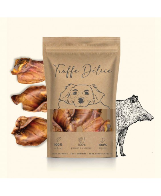 Mežonīga garša jutīgākajiem mājdzīvniekiem! Truffe Délice žāvētas mežacūkas ausis ir 100% dabīgs, hipoalerģisks košļājamais produkts ar zemu tauku un augstu olbaltumvielu saturu. Tā ir lieliska alternatīva parastajām cūku ausīm, kas nodrošina ilgstošu aktivitāti, palīdz dabiski tīrīt zobus un masēt smaganas. Ideāli piemērots suņiem ar alerģijām vai jutīgu gremošanu.