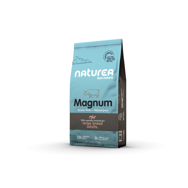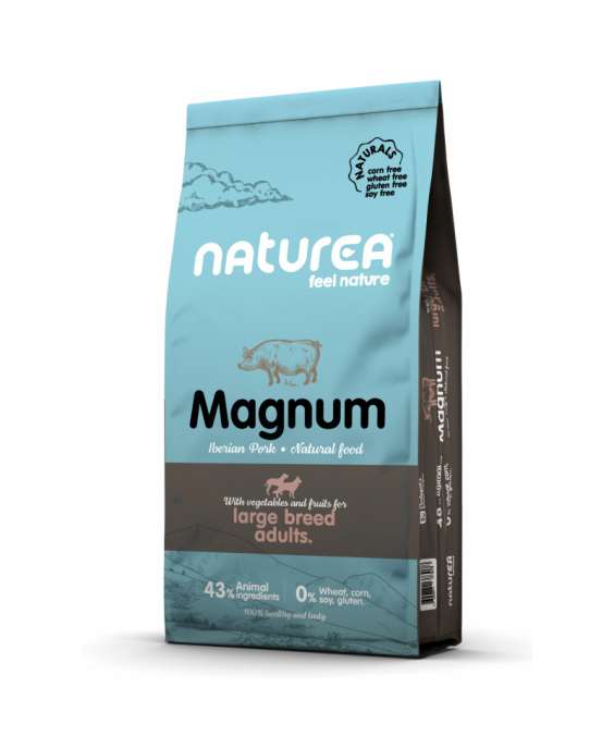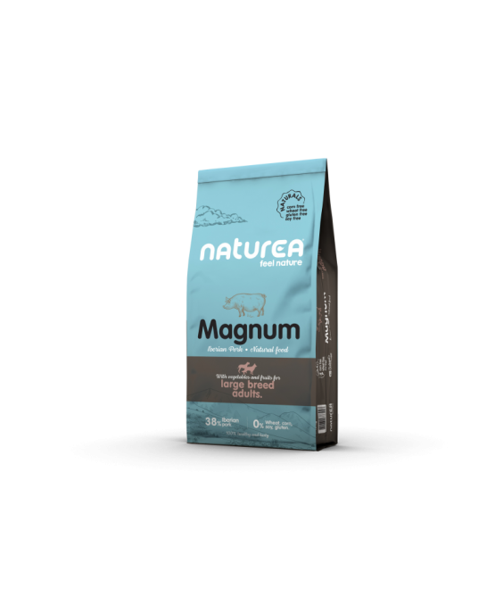 NATUREA NATURALS Adult Large Breed MAGNUM (Iberijas cūkgaļa ) ir augstākās kvalitātes barība suņiem, kas pagatavota no Iberijas cūkgaļas, ko papildina vērtīgi brūnie rīsi, augļi, dārzeņi, garšaugi, garšvielas un aļģes. Barība ir paredzēta pieaugušiem lielo šķirņu suņiem.
