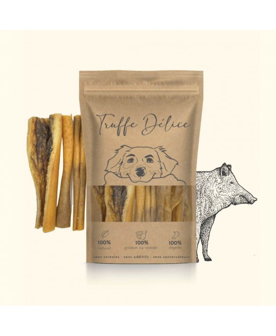 Ilgnoturīgs košļājamā prieka baudījums visprasīgākajiem! Truffe Délice kaltēta mežacūkas āda ir ļoti ciets, 100% dabīgs košļājamāmais produkts, kas ir lieliska alternatīva liellopu vai cūkgaļas ādai. Šis hipoalerģiskais kārums ne tikai apmierina jūsu suņa spēcīgo nepieciešamību košļāt, bet arī efektīvi tīra viņa zobus un stiprina žokļa muskuļus. Ideāli piemērots alerģiju slimniekiem un vidēji smagiem vai smagiem košļājamiem suņiem.